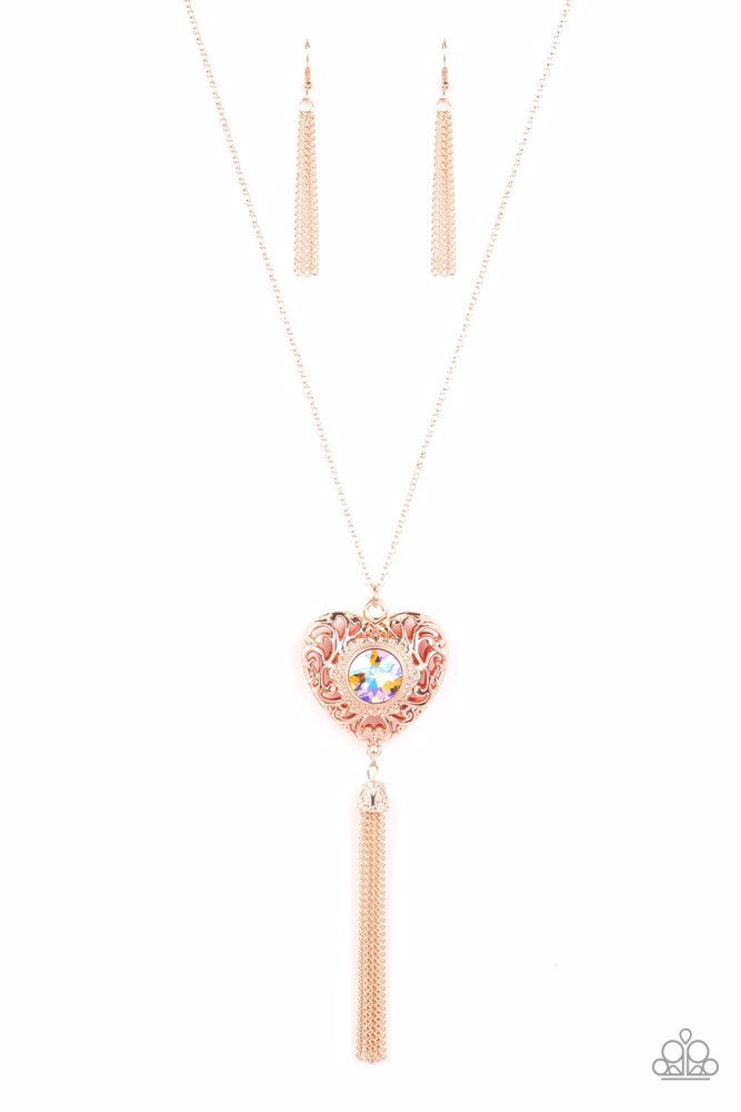 A magical iridescent peach gem sparkles at the center of a 3-dimensional rose gold heart. Filled with vine-like filigree, the locket inspired heart frame glides along an extended rose gold chain while a shimmery rose gold chain tassel dances from the bottom for a flirtatious finish. Features an adjustable clasp closure. Due to its prismatic palette, color may vary.