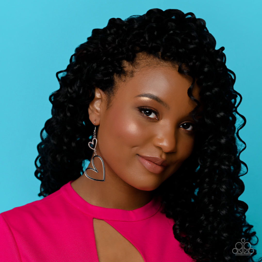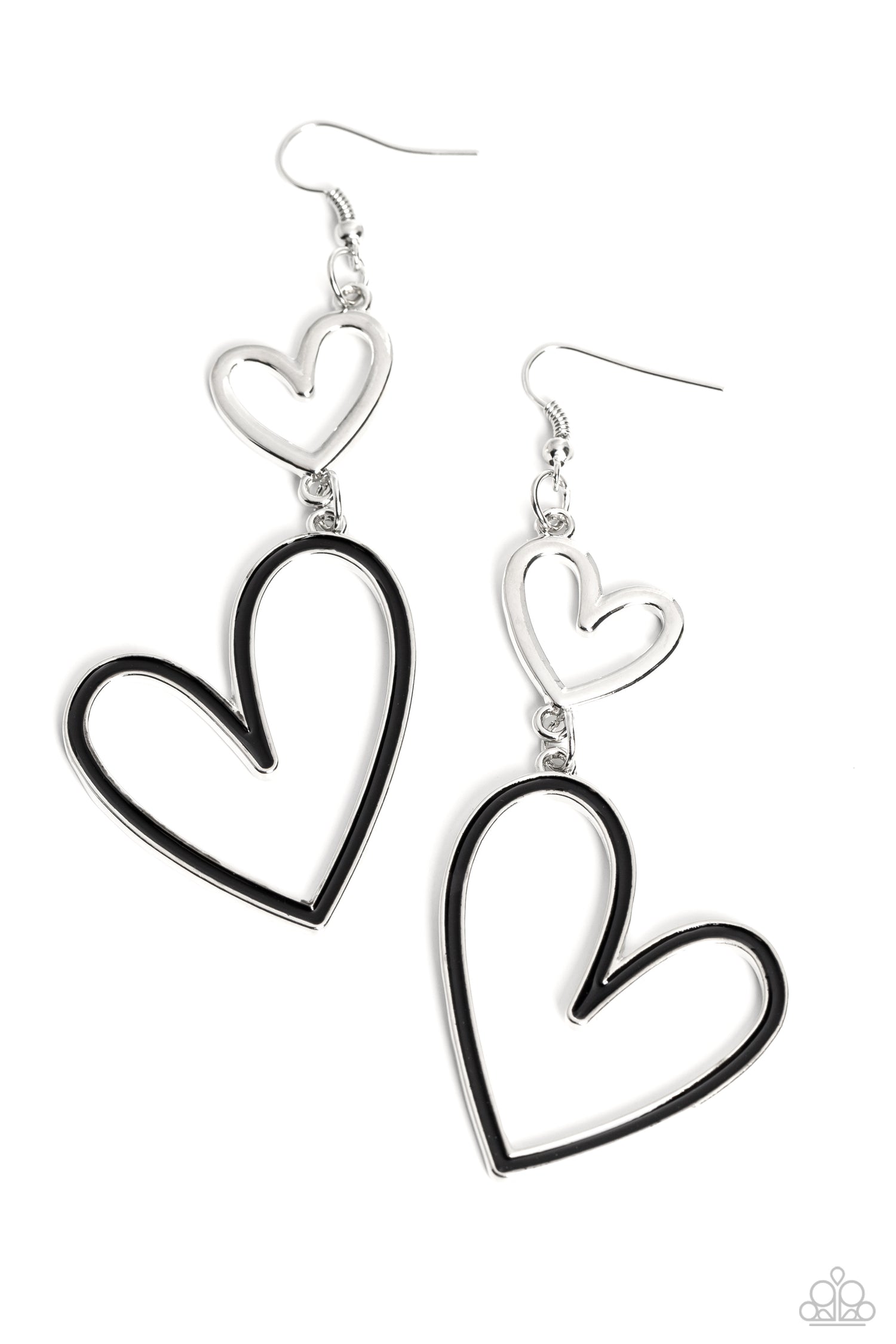 Dangling from an abstract silver heart frame, another heart frame, this time an oversized one, features a border of black paint, creating an attention-grabbing romantic statement below the ear. Earring attaches to a standard fishhook fitting.