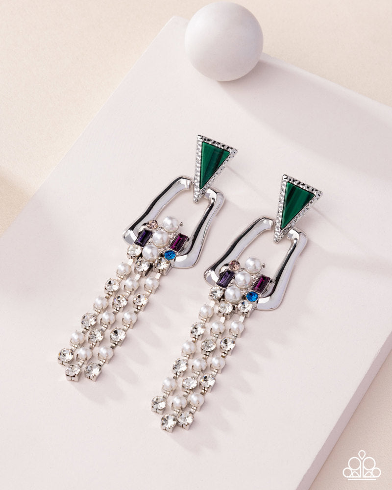 Pressed in a hammered silver frame, an upside-down green-striped triangular stone glistens from the ear where an abstract silver frame is threaded through its bottom point. An emerald-cut purple and fuchsia gem and an aquamarine and light amethyst rhinestone pattern beside white pearls and white rhinestone strands pressed in silver square fittings that give way from the abstract frame for an eye-catching sway of chic and cultured color. Earring attaches to a standard post fitting. As the stone elements in this piece are natural, some color variation is normal.
