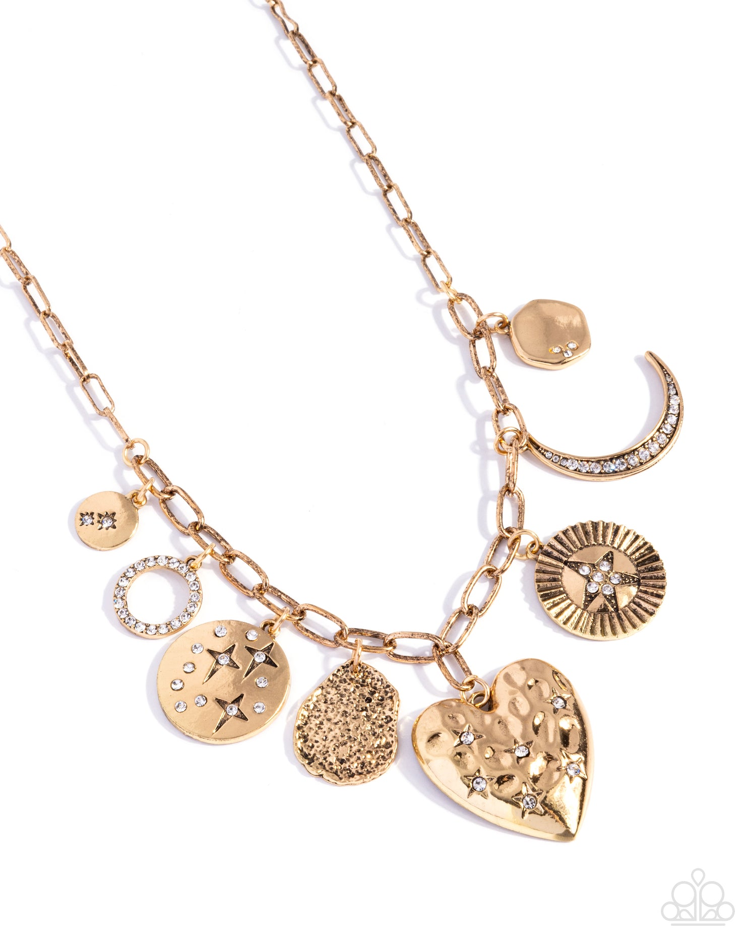 Swaying along an antiqued gold abstract chain, a collection of radiant antiqued gold charms including a white rhinestone star-embellished disc, a white rhinestone-bordered disc, a smashed gold disc with white rhinestone detailing, a white rhinestone-embellished crescent moon, a white rhinestone-embellished star and sunburst-textured gold disc, a hammered gold heart with white rhinestone-dotted stars, a hammered abstract gold charm, and a large gold disc with white rhinestone stars and dust cascade below the neckline for a cosmically chic look. Features an adjustable clasp closure.