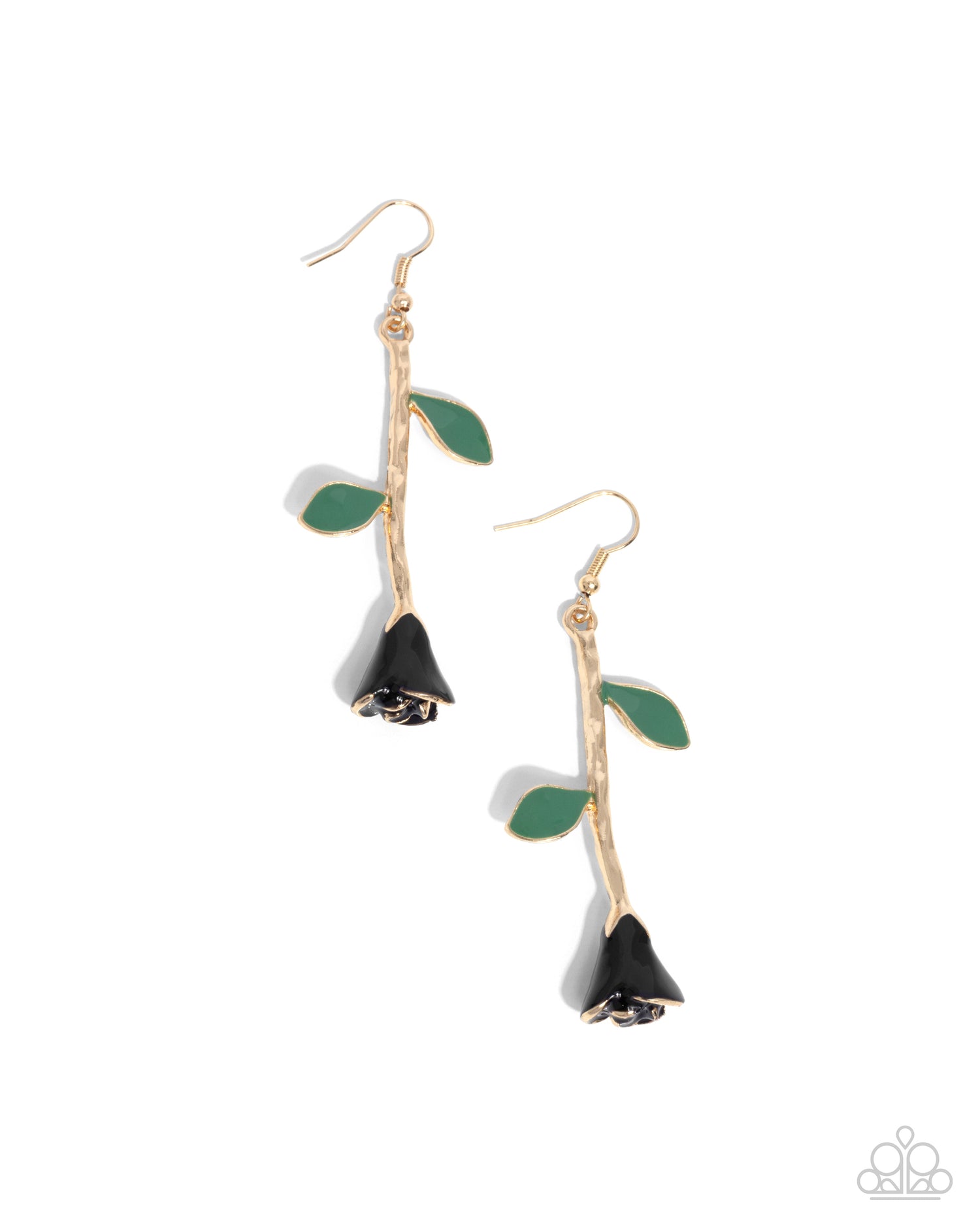 A hammered gold stem features a duo of green-painted leaves and a black-painted rose that extends below the ear for a botanically beautiful look. Earring attaches to a standard fishhook fitting.