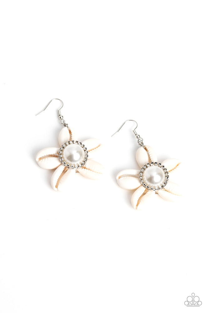 White cowrie shells surf out around an oversized white pearl center encased in a silver-pronged frame for a beach-inspired floral centerpiece. Earring attaches to a standard fishhook fitting.