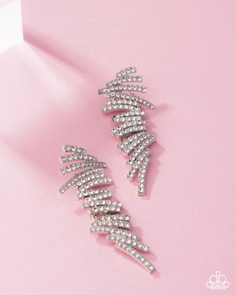 An icy stack of white rhinestone-embellished silver bars in varying sizes stagger and cascade below the ear, coalescing into a shockingly sparkly frame. Earring attaches to a standard post fitting.