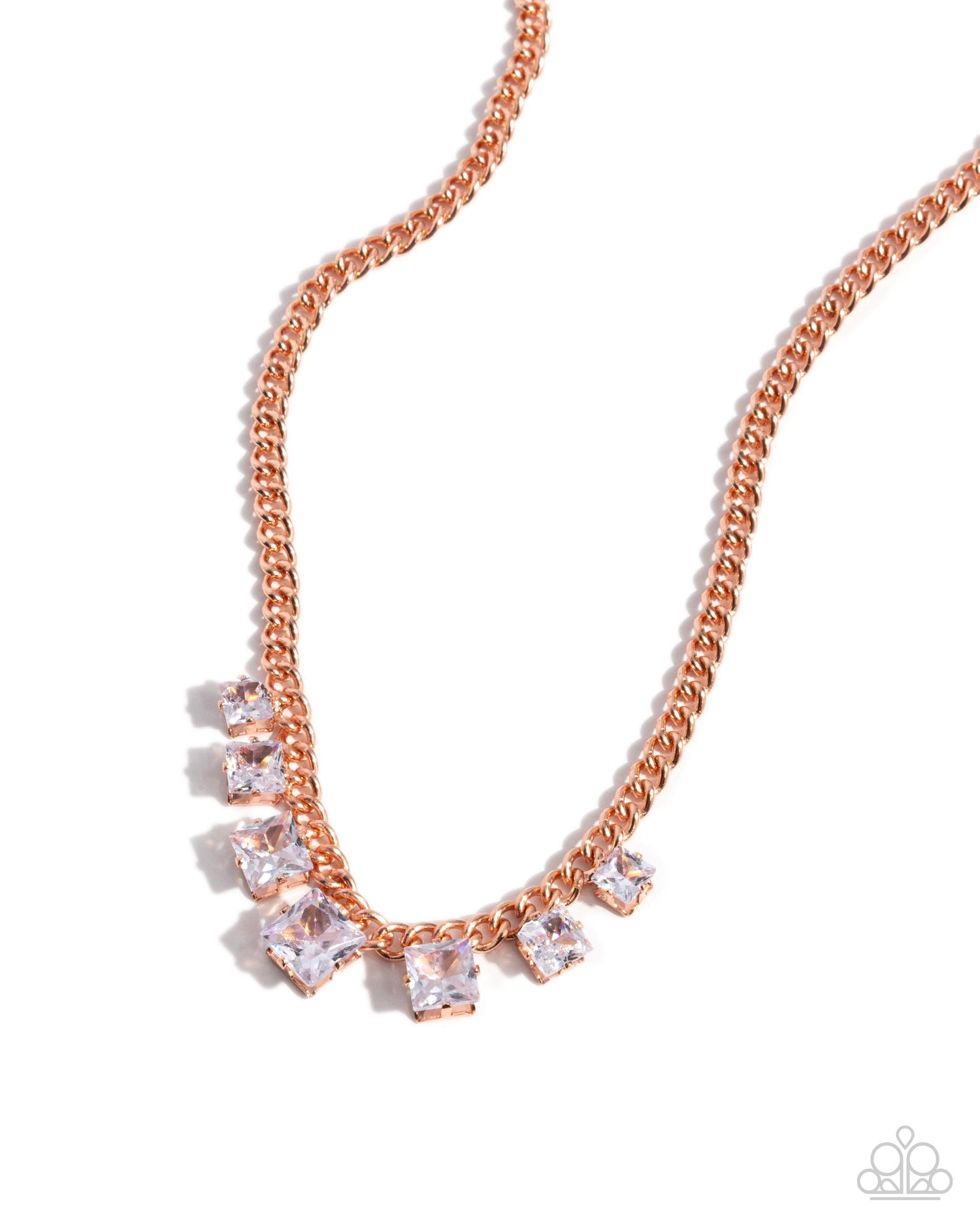 Pressed in elevated shiny copper fittings, faceted white square gems are sporadically sprinkled along a shiny copper curb chain, gradually increasing in size along the center of the neckline, adding a dramatic, dauntless flash of glitz. Features an adjustable clasp closure.