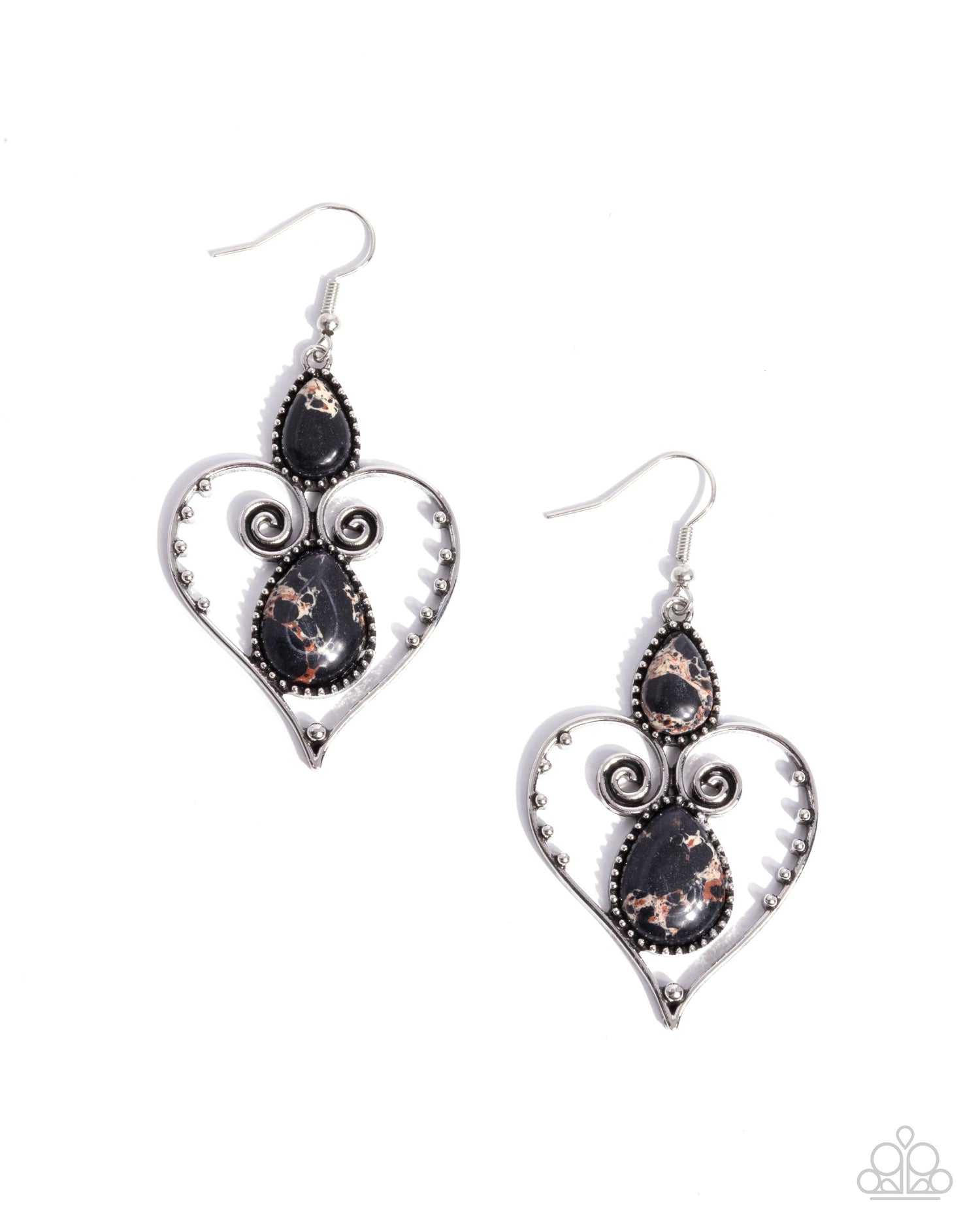Heart-shaped silver frames, adorned with intricate swirls and dotted accents, encase teardrop-shaped marbled black stones. As the stone elements in this piece are natural, some color variation is normal. Earring attaches to a standard fishhook fitting.