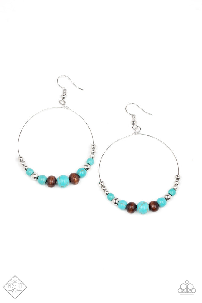 An earthy collection of silver, wooden, and turquoise stone beads slide along a dainty silver wire hoop for a colorfully artisan inspired look. Earring attaches to a standard fishhook fitting.