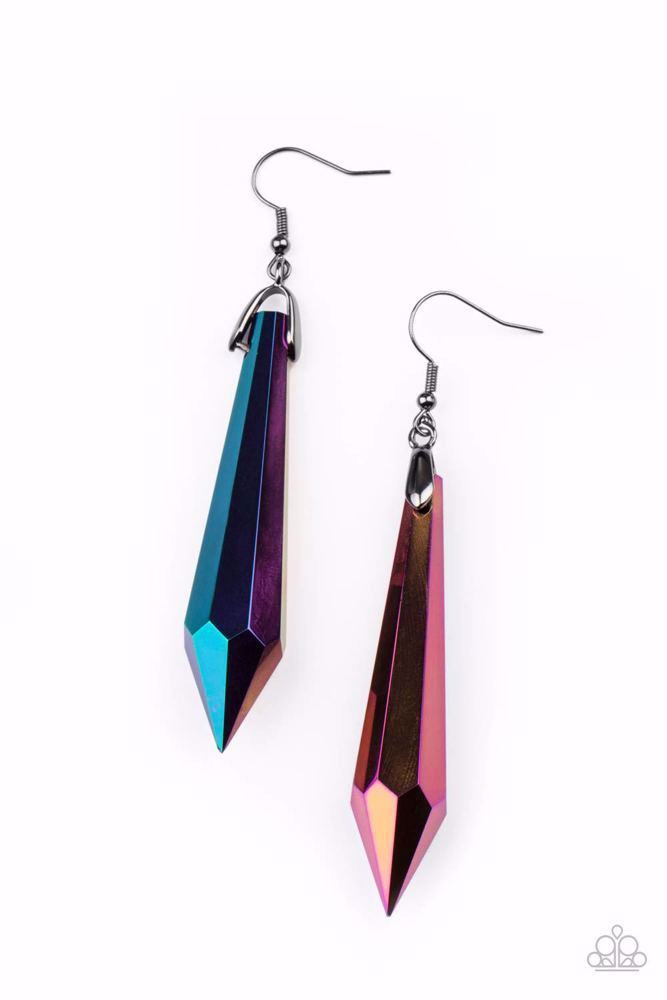 Featuring a stellar oil spill finish, a dramatically elongated gem attaches to a gunmetal fitting that swings from the ear for a hypnotizing fashion. Earring attaches to a standard fishhook fitting.