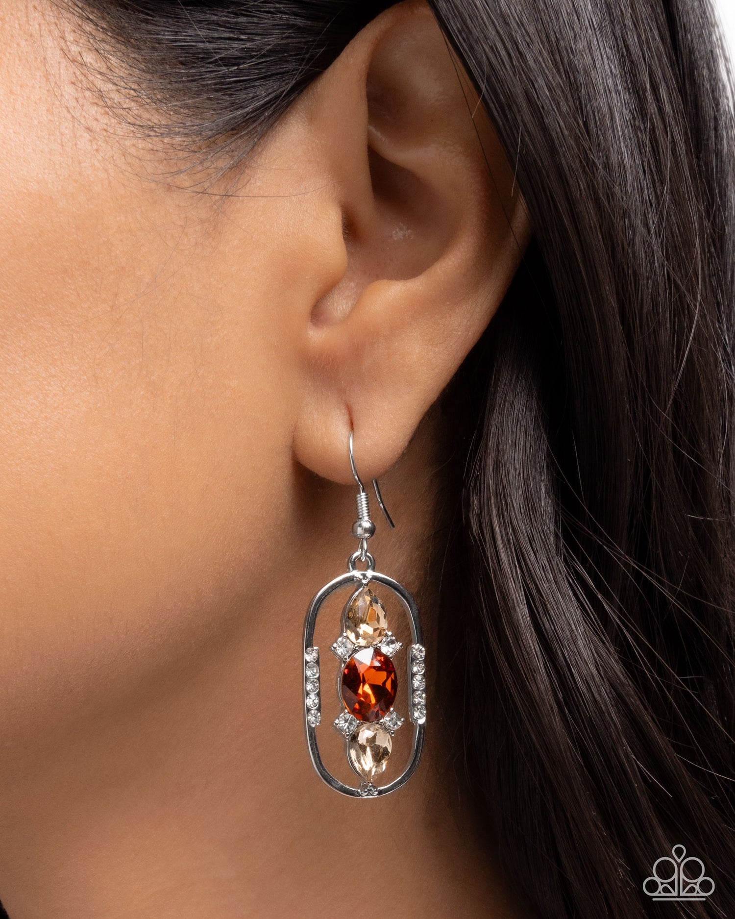 A trio of glittering gemsâtwo topaz-hued teardrops and a rich tea ovalâare elegantly encased within sleek silver frames. The surrounding accents of white rhinestones add a touch of timeless sparkle, creating a refined and radiant design. Earring attaches to a standard fishhook fitting.