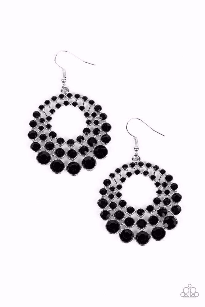 Gradually increasing in size and intensity, row after row of glassy jet black rhinestones stack into a layered hoop for a blinding effervescence. Earring attaches to a standard fishhook fitting.