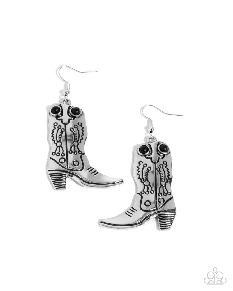 Dotted with dainty black stones, a Western-inspired detail-stamped silver cowboy boot do-si-dos below the ear for an eye-catching look. Earring attaches to a standard fishhook fitting.