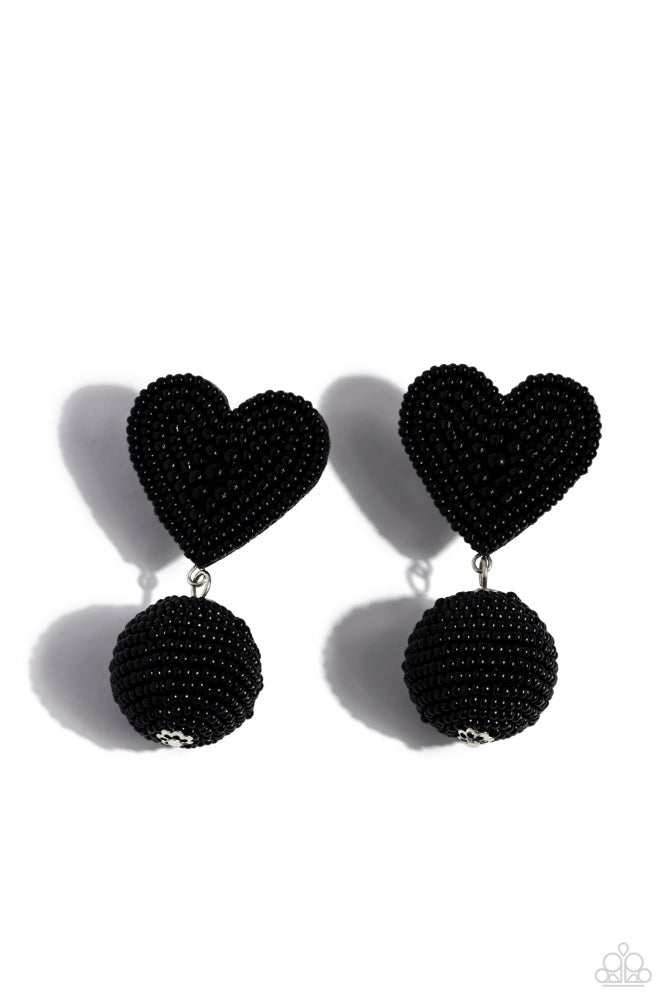 A black seed bead heart frame gives way to strands of black seed beads that decoratively spin around a spherical frame, resulting in a colorful three-dimensional display. Earring attaches to a standard post fitting.