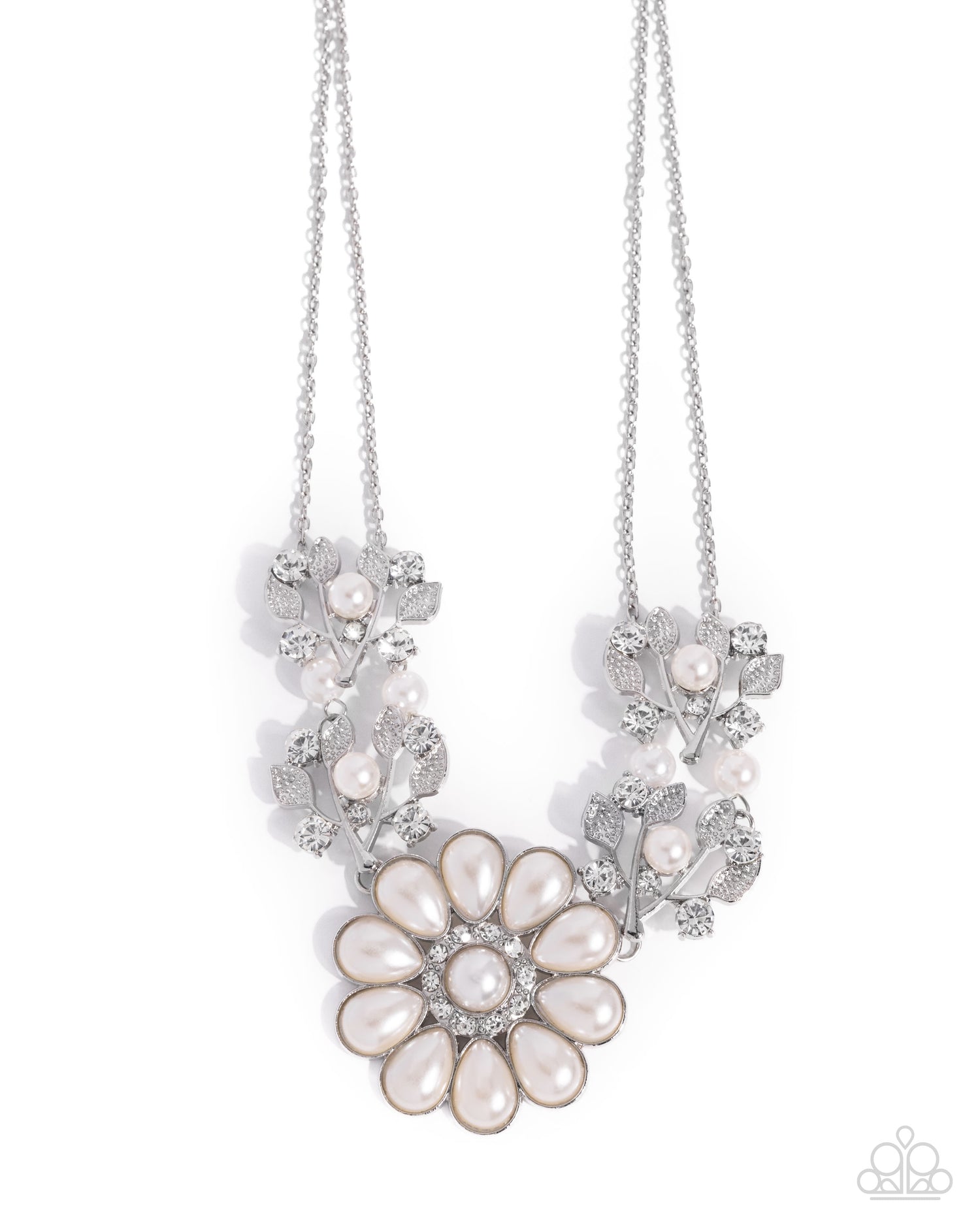Merging with a solitaire classic silver chain, duos of silver cable chains coalesce below the neckline suspending whimsical textured silver leaves joined by white rhinestones and white pearls. The centermost pendant features teardrop pearl petals around a white rhinestone and round pearl centerpiece for a refined radiant finish. Features an adjustable clasp closure.