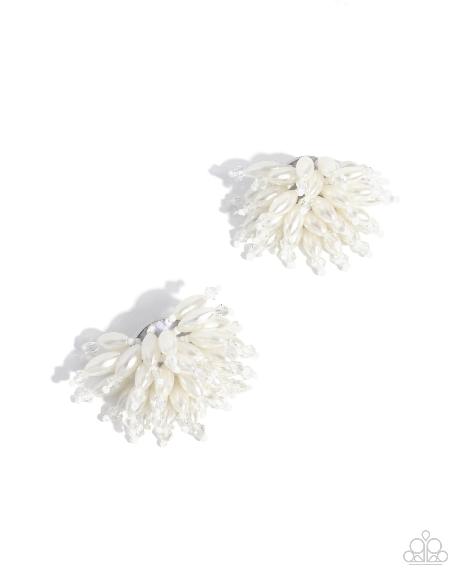 Exploding from a circular silver post, a collection of white pearly oval beads, white seed beads, and crystal-like faceted beads cascade in strands below the ear for an infatuated, Sunset-inspired statement. Earring attaches to a standard post fitting.