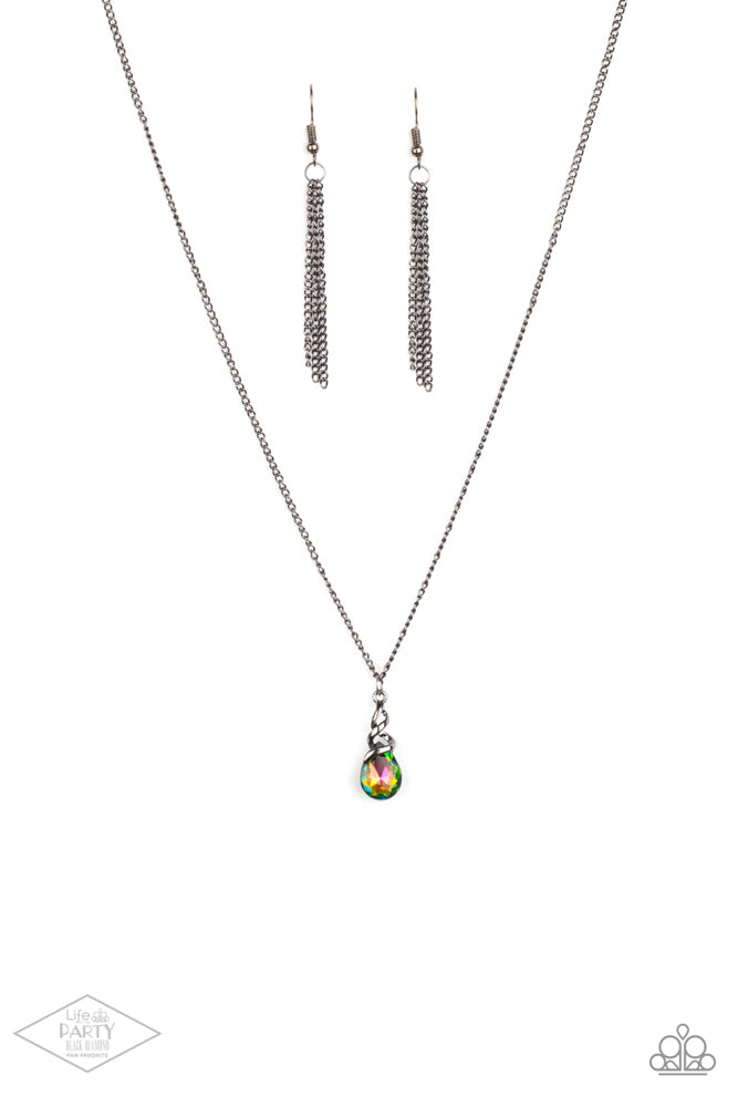 A shimmery gunmetal wire-like frame wraps around the top of a glittery rainbow teardrop gem, creating a timeless pendant below the collar. Features an adjustable clasp closure.