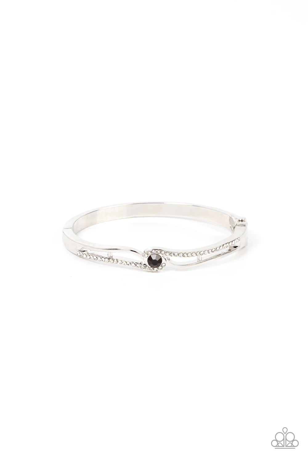 Ribbons of shiny silver and white rhinestone encrusted silver bars wrap around a glittery purple rhinestone center, resulting in a timeless shimmer atop a versatile bangle-like bracelet. Features a hinge closure.