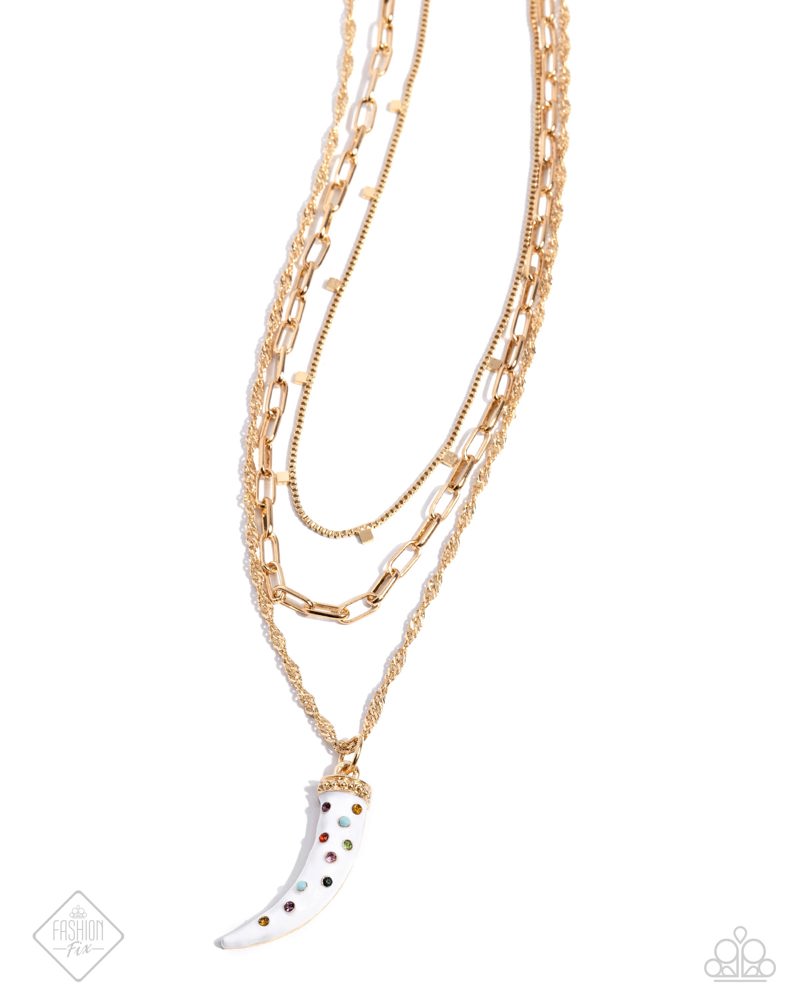 Mismatched strands of dainty gold box chain sporadically dotted with gold cubes, a classic paperclip, and an extended singapore chain layer across the chest, resulting in an edgy eclectic centerpiece. Featuring an off-white pearl-painted hue, an elephant tusk dusted with multicolored rhinestones glimmers from a gold-studded fitting along the lowermost chain for an expressively elegant finish. Features an adjustable clasp closure.