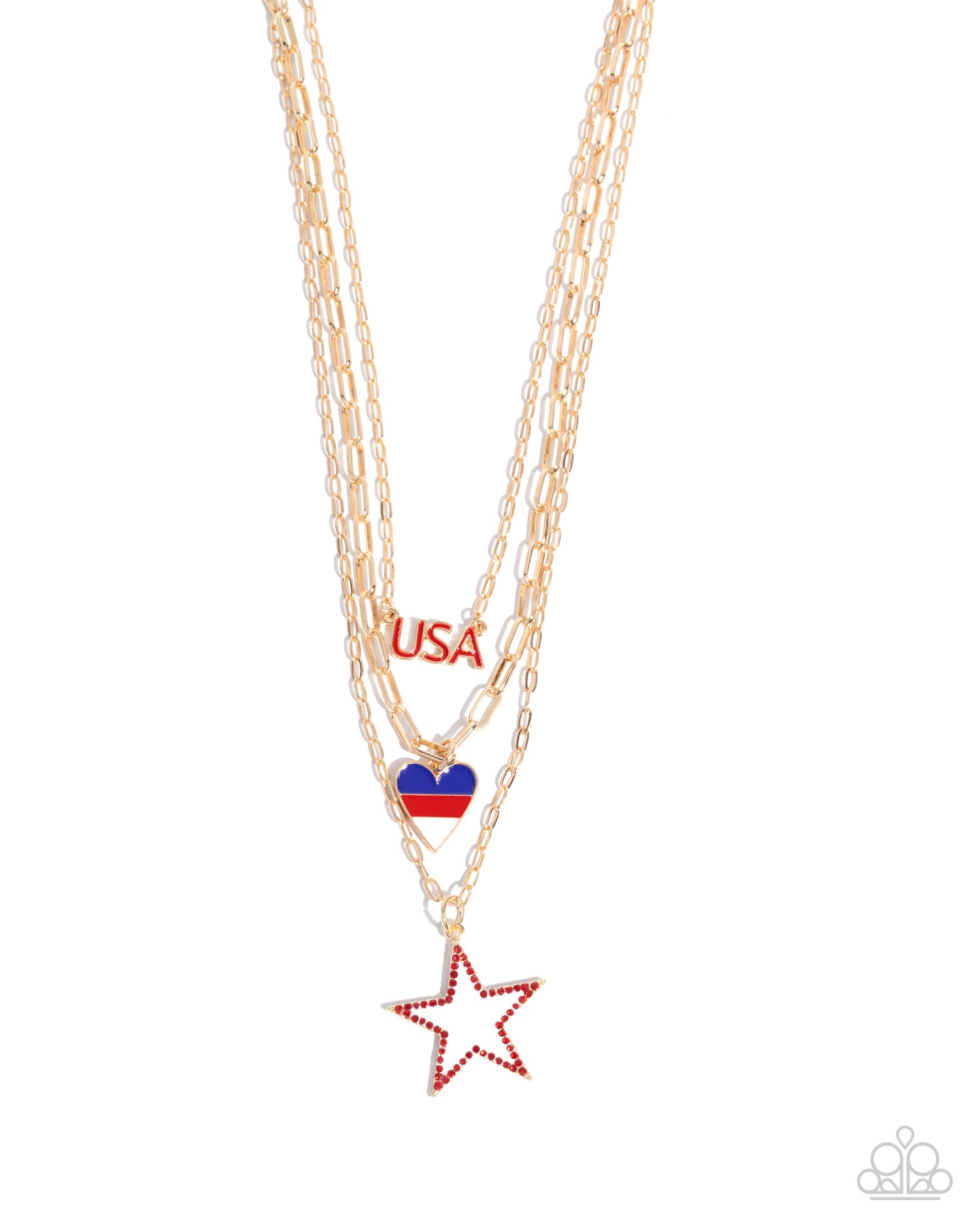 Featuring a trio of gold paperclip chains in varying sizes, the words "USA" in red paint, a red, white, and blue-painted gold heart, and a white-painted star with a border of red rhinestones layer below the neckline for a proud patriotic display. Features an adjustable clasp closure.