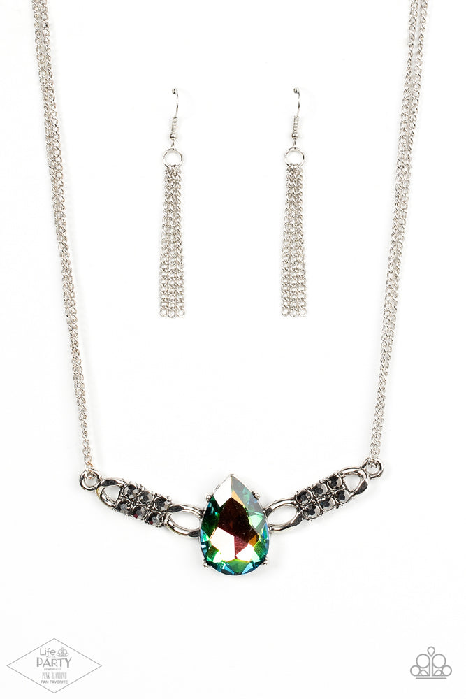 Cut into an alluring teardrop, an oversized oil spill rhinestone gem attaches to bold silver frames radiating with smoky hematite rhinestones. The dramatic pendant attaches to doubled silver chains, swinging horizontally below the collar in a glamorous fashion. Features an adjustable clasp closure.