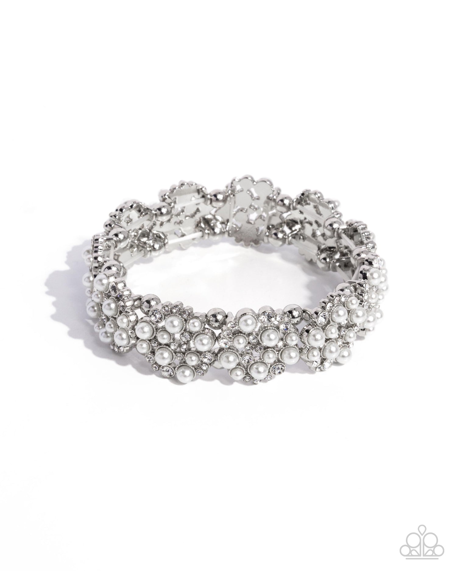 Clusters of white pearls and dazzling white rhinestones are encrusted along a stretchy silver band, creating a glamorous floral-inspired design.