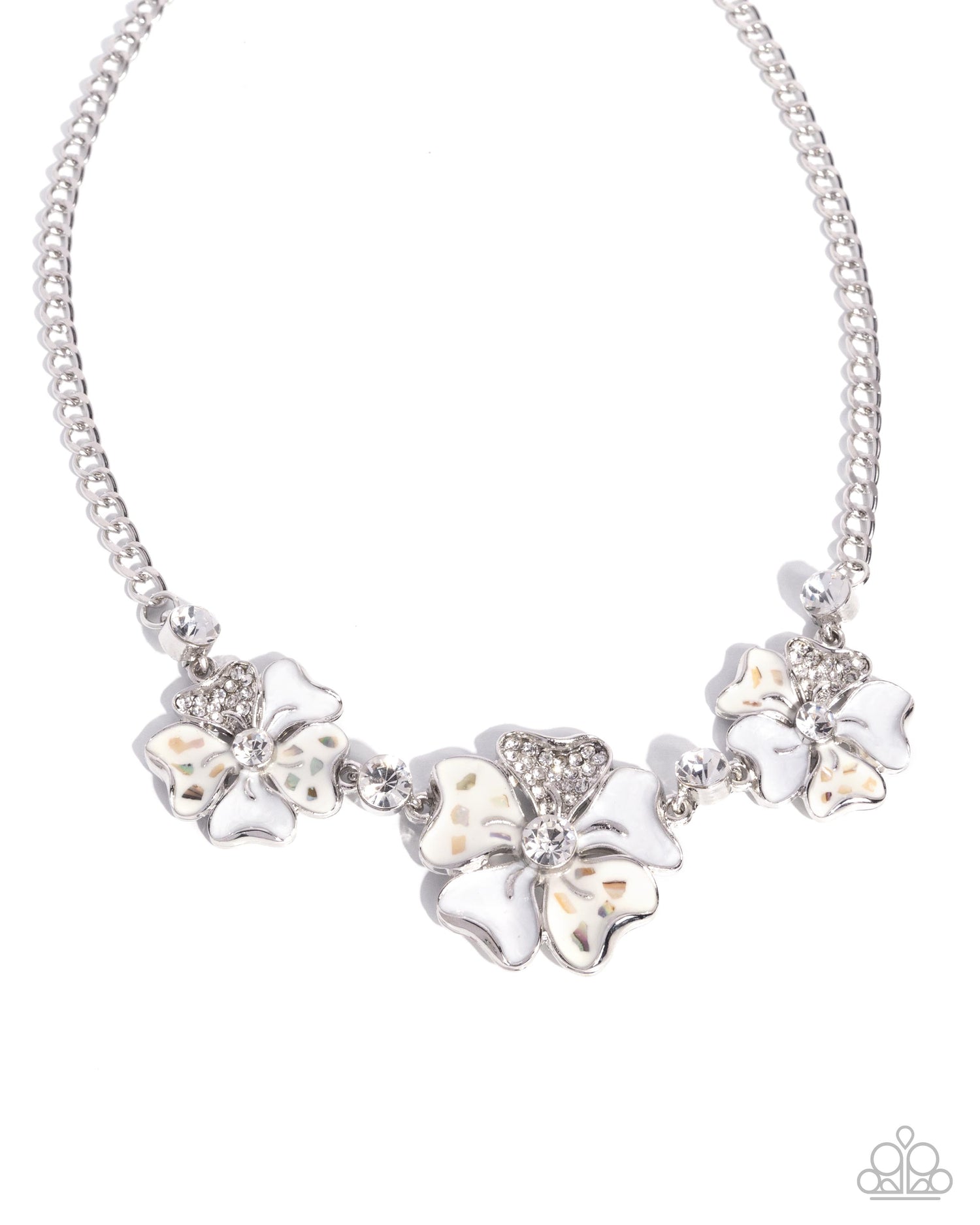 Delicate floral frames with pearly cream and white-painted petals and rhinestone-dotted centers bloom along a polished silver chain. The soft hues and sparkling details give a feminine and charming vibe, perfect for uplifting any outfit with a touch of elegance. Features an adjustable clasp closure.