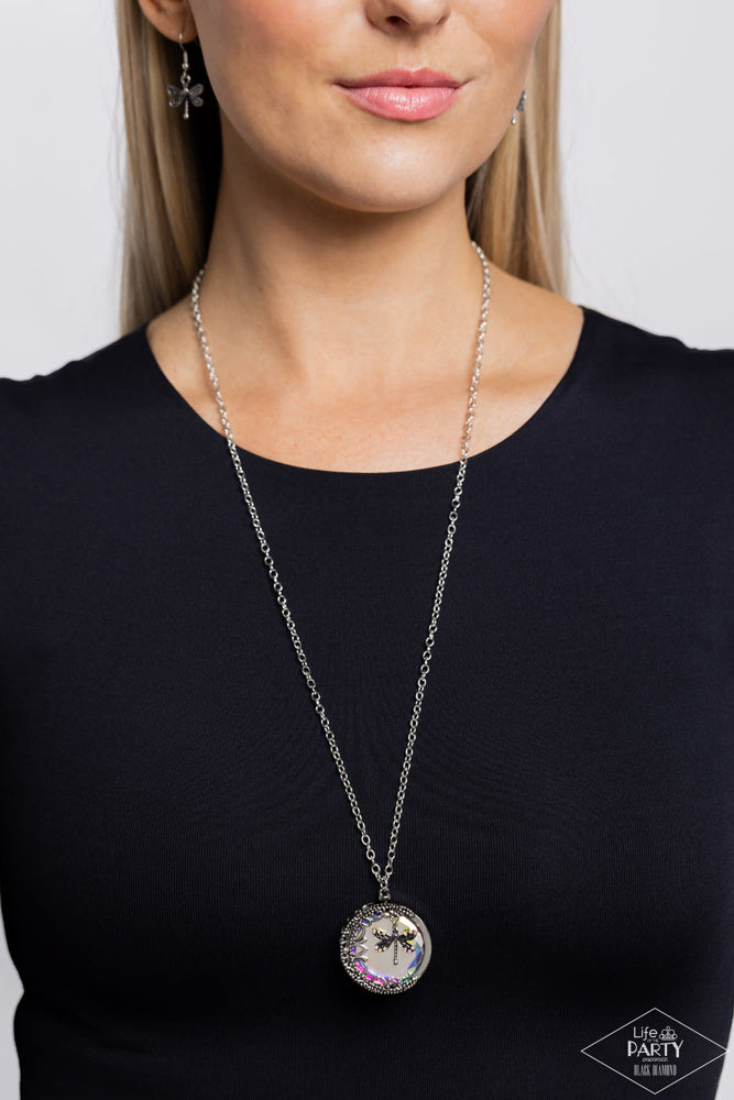 Falling from a high-sheen elongated silver chain, a thick circular pendant with a faceted iridescent center lengthens the torso as it swings from the bottom of the chain. Swinging from the center of the shimmery pendant, an intricate dragonfly charm, lined with dainty iridescent rhinestones creates additional eye-catching movement. Silver filigree and a dot motif border one side of the circular design, overlapping on the front side to create whimsical cutouts for an elegantly earthy finish. Due to its prismatic palette, color may vary. Features an adjustable clasp closure.